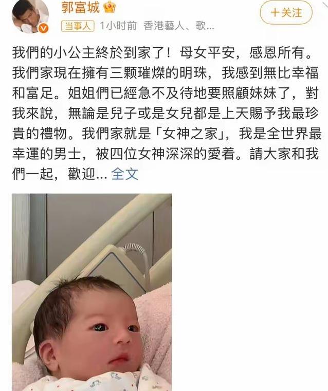 郭富城又当爹了!10月22日晚,天王在社交平台晒出一张新生女儿的照片益通网,小家伙大眼睛、小脸蛋,萌得让人心动。字里行间,郭富城满满的幸福感藏都藏不住:“母女平安,我是全世界最幸运的男人,有四个女神爱着我。”这波狗粮,甜得像刚出炉的蛋糕,网友们刷屏点赞,评论区全是姨母笑。