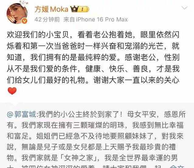 方媛也在社交平台分享了自己的心情。她转发了郭富城的动态,配文满是对老公的感激和爱意。夫妻俩同框的画面,甜得像偶像剧。方媛还说,三个女儿是她和郭富城最大的财富,未来只想一家人平平安安,幸福快乐。这话一出,网友直呼:“这对太会了,甜到齁!”